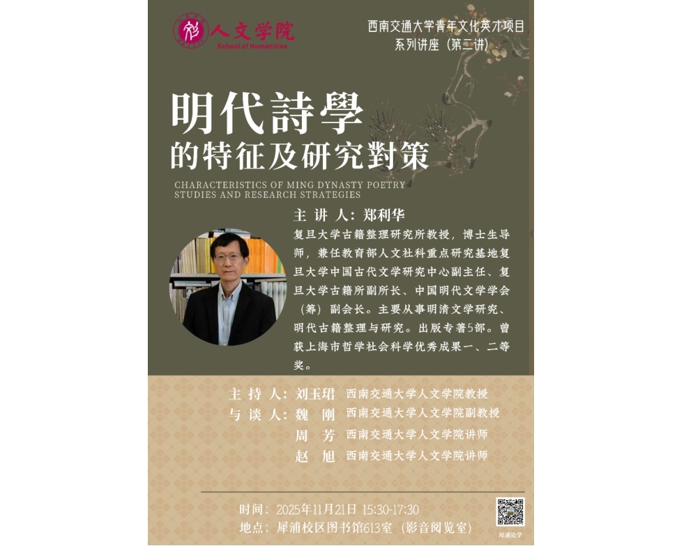 主讲人:复旦大学古籍整理研究所 郑利华教授讲座时间:2025年11月21日 15:30-17:30讲座地点:犀浦校区图书馆613室(影音阅览室)主办单位:色花堂 主持人:色花堂 刘玉珺教授主讲人介绍:郑利华,复旦大学古籍整理研究所教授,博士生导师,兼任教育部人文社科重点研究基地复旦大学中国古代文学研究中心副主任、复旦大学古籍所副所长、中国明代文学学会(筹)副会长。主要从事明清文学研究、明代古籍整理与研究。...