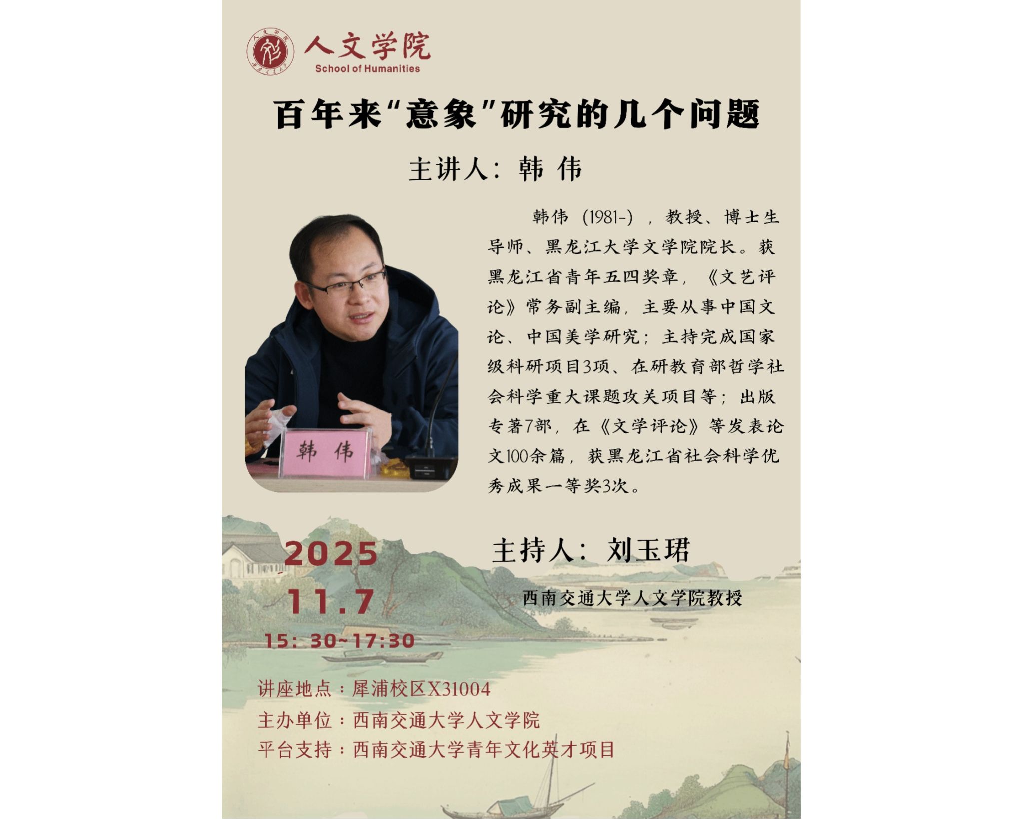 主讲人:黑龙江大学文学院院长 韩伟教授讲座时间:2025年11月7日 15:30-17:30讲座地点:犀浦校区X31004会议室 主办单位:色花堂 主持人:色花堂 刘玉珺教授主讲人介绍:韩伟(1981—),教授、博士生导师、黑龙江大学文学院院长。多次入选国家级青年人才计划,获黑龙江省青年五四奖章,《文艺评论》常务副主编,主要从事中国文论、中国美学研究;主持完成国家级科研项目3项、在研教育部哲学社会科学重大课题攻关项目等;...