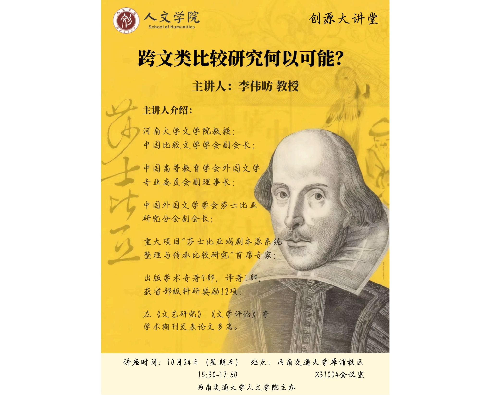 主讲:李伟昉 教授时间:2025年10月24日下午15:30-17:30地点:色花堂 X31004会议室主讲人简介:河南大学文学院教授,河南大学中国语言文学博士点一级学科带头人,《河南大学学报》编辑部主任、主编。全国优秀博士学位论文奖获得者,教育部中文教学指导委员会委员,国家教材委员会学科专家组成员,国家社科基金评审专家,剑桥大学、哈佛大学访问学者,中国比较文学学会副会长,中国外国文学学会莎士比亚研究分会副会长,中国高等教育学会外国文学专业委员会副理事长,...