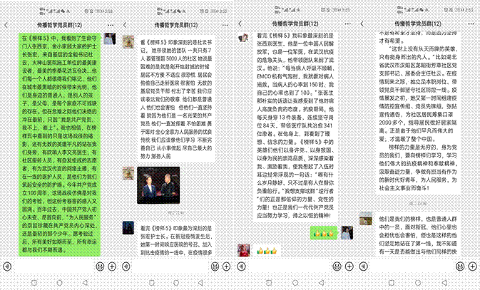《榜样5》是一档反映新冠肺炎疫情防控阻击战中先进基层党组织和优秀共产党员典型事迹的专题节目,支部成员在共同观看了节目后,各位同学积极踊跃地在党支部微信群内发表自己的观点,分享各自的收获与心得。