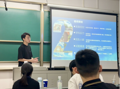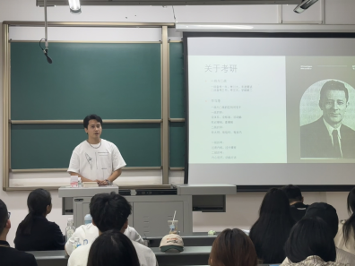 随后,2020级传播学专业本科生、2024级新闻传播学专业“准研究生”常齐轩同学做了“一战成硕:选择比努力重要”的主题分享。他的分享主要包括新传考研形势、如何更好地择校以及如何高效备考三个方面。首先,他重点分享了自己选择本校读研的主要原因:在他看来,选择比努力更重要,本校不仅备考难度适中,而且在城市潜力、区域认可度、师资、实习就业机会等方面都有着诸多优势。紧接着,他结合自身经历,为同学们提供了政治、英语、专业课备考过程中所积攒的宝贵经验,并寄语学弟学妹:“考研是一场持久战,要有自己的节奏,要找到高效的备考方法,更为重要的是要保持平稳的心态并坚持到最后。”
