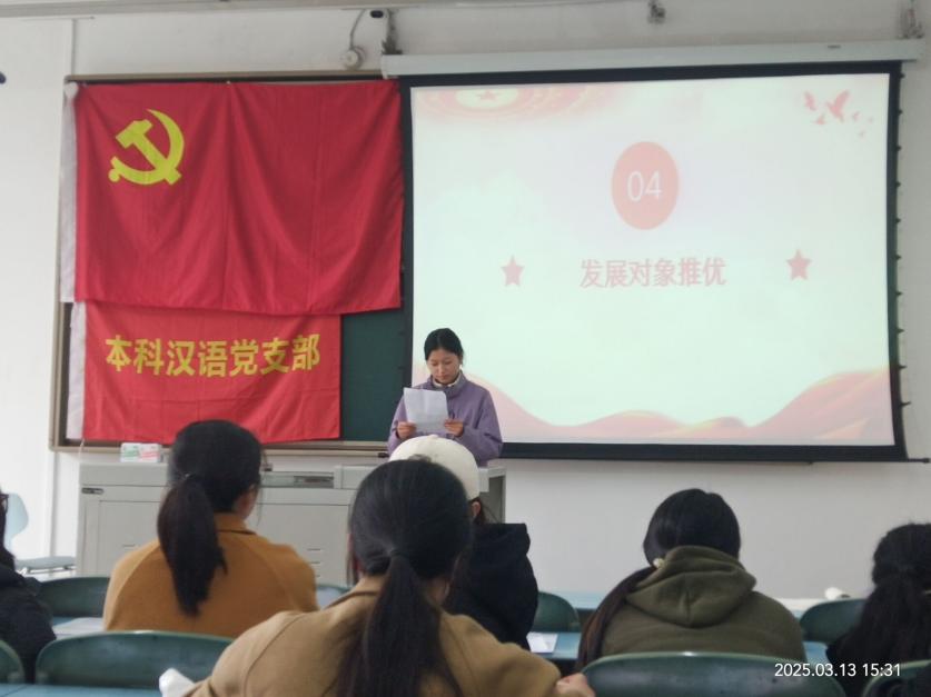 随后,按照议程,党支部进行发展对象推优。各位积极分子有序发言,主动向党组织汇报个人思想和生活情况,增进党组织对新生力量的了解,为党组织注入新活力。