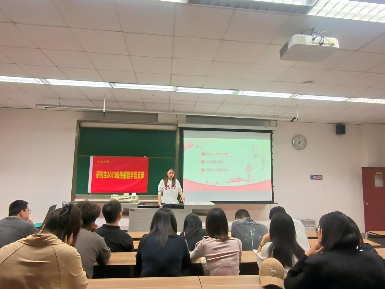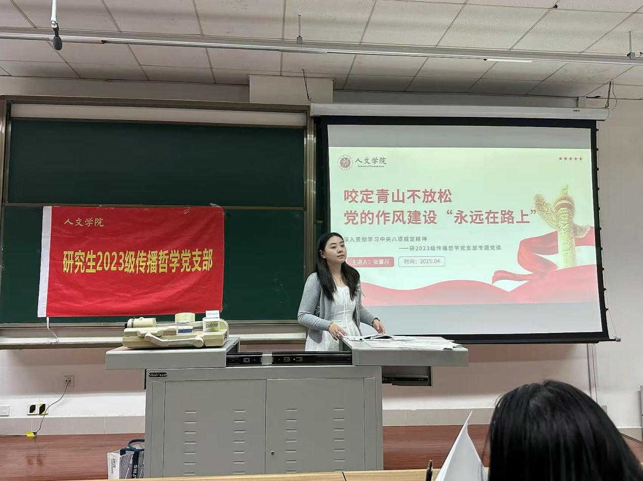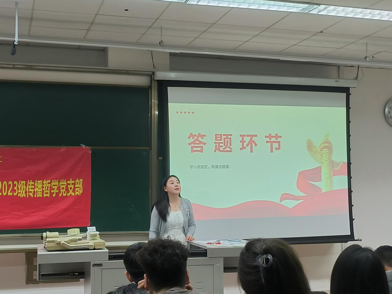 研2023级传播哲学党支部在九里校区J4106开展4月主题党日活动。本次活动由党支部书记张馨月主持。
