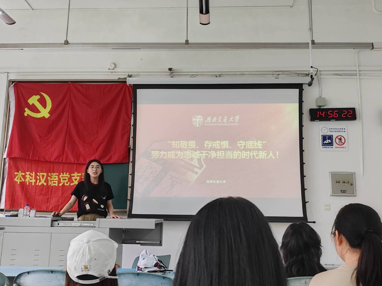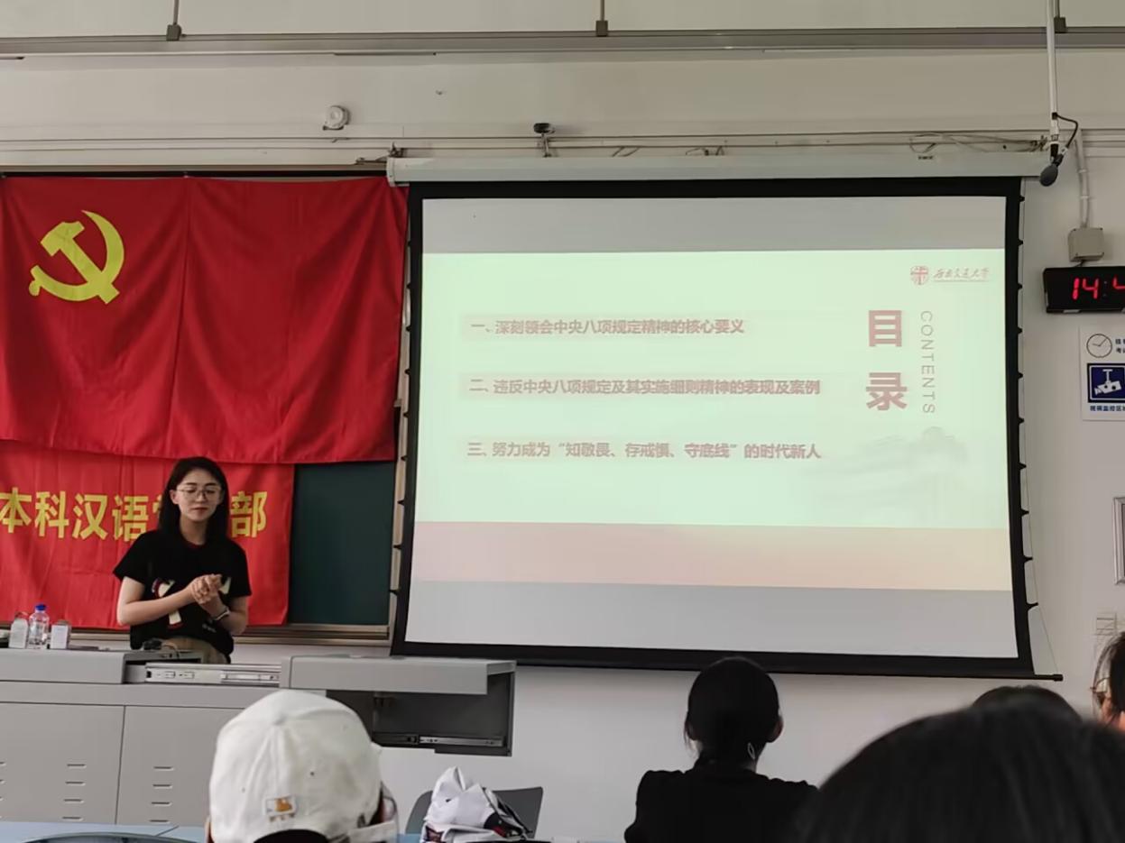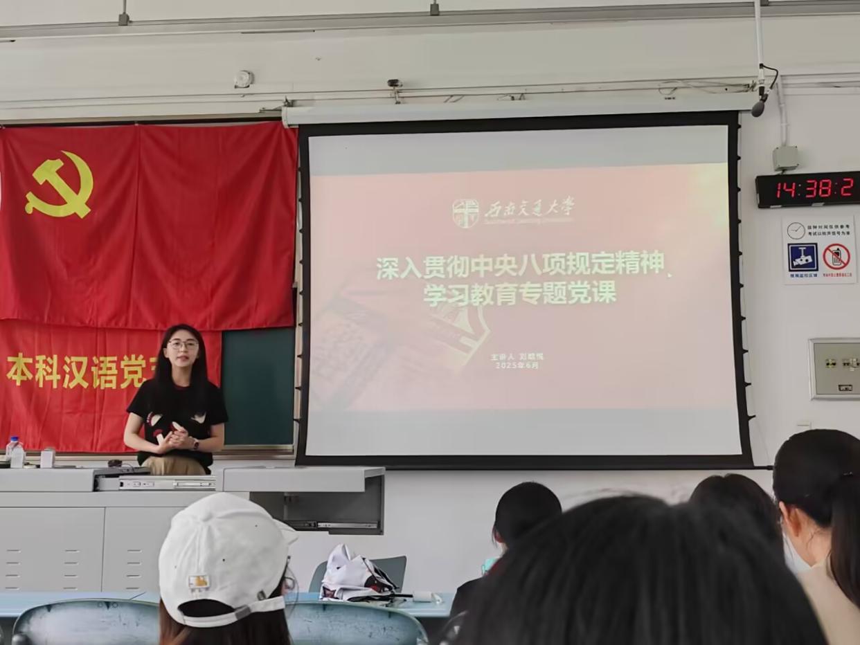 本科汉语党支部于犀浦校区X2220开展深入贯彻中央八项规定精神学习教育。本次活动由支部书记刘晗悦同志领学,支部全体成员参加学习。
