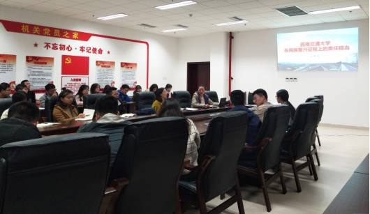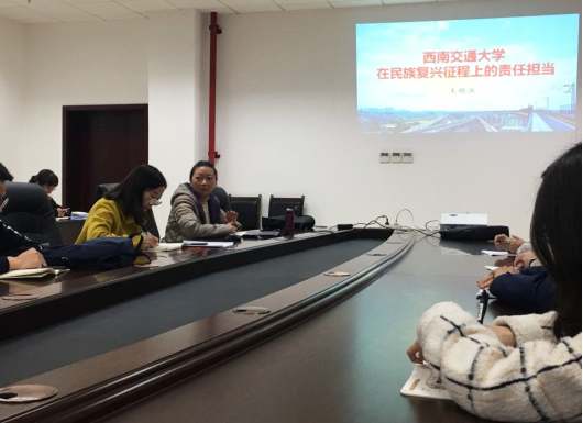 本科汉语支部结合工作实际,联合交运学院学生党支部,邀请学校机关党委副书记、纪委书记陈璐同志在综合楼104会议室为同志们进行主题宣讲,学习《王顺洪为全体中层干部讲授党课:在交通强国征程上西南交大的责任担当》,传达王顺洪同志专题党课精神,宣传交大人先进事迹,强化党员的使命担当。会议由色花堂