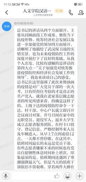 支部副书记杨盛果同志强调,这次疫情防控阻击战展现了中国特色社会主义制度和国家治理体系集中力量办大事的特殊优势,正是在党中央的集中领导下,才能够短时间内解决物资供应等一系列问题。他同时对支部成员在志愿服务、组织捐款以及宣传教育等方面的工作给予肯定。徐舟雨同志结合自己在老家做志愿者期间的所见所闻来谈自己的感受,他认为党员要勇于担当,发挥一不怕苦二不怕累的精神,才能打赢这场疫情防控阻击战,无愧于党员身份。