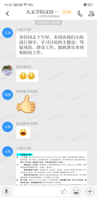 3月26日下午15:30,在进行“驾驭风险本领、群众工作本领、狠抓落实本领和防疫工作”的主题学习时,王岚同志从习近平总书记在统筹推进新冠肺炎疫情防控和经济社会发展工作部署会议上提出的“六稳”措施入手,引导大家思考防疫工作中有利于党提高执政能力的经验。入党积极分子宋群同学结合生活实际,谈到了国家相关信贷措施,栾潇同学则谈到了国企今明两年扩招高校毕业生的举措等。