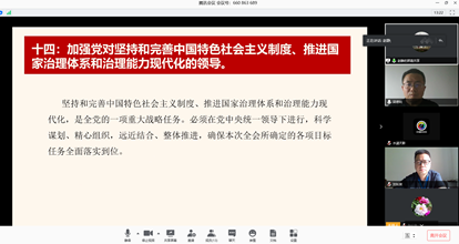 首先,赵静副教授带领教师学习《中共中央关于坚持和完善中国特色社会主义制度、推进国家治理体系和治理能力现代化若干重大问题的决定》的精神。具体有:坚持和完善党的领导制度体系,提高党科学执政、民主执政、依法执政水平;坚持和完善人民当家作主制度体系,发展社会主义民主政治;坚持和完善中国特色社会主义法治体系,提高党依法治国、依法执政能力等十四项内容。通过学习,广大党员教师深切领会到中国特色社会主义制度和国家治理体系是以马克思主义为指导、植根中国大地、具有深厚中华文化根基、深得人民拥护的制度和治理体系,是具有强大生命力和巨大优越性的制度和治理体系,是能够持续推动拥有近十四亿人口大国进步和发展、确保拥有五千多年文明史的中华民族实现“两个一百年”奋斗目标进而实现伟大复兴的制度和治理体系。