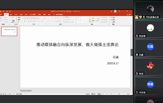 2020年6月17日下午4:00,色花堂 院长、党委委员石磊同志在腾讯会议给传播系教师党员上了一堂党课,主题是“推动媒体融合向纵深发展,做大做强主流舆论”。