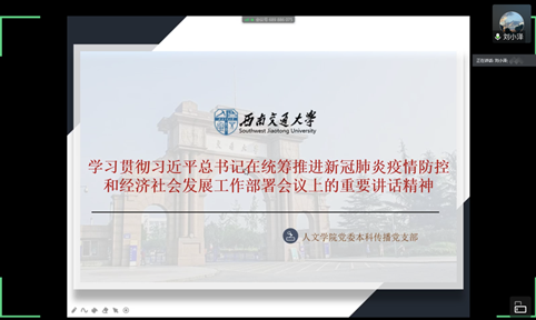 传播党支部在线上举行了主题党日活动。活动主要内容为学习贯彻习近平总书记在统筹推进新冠肺炎疫情防控和经济社会发展工作部署会议上的重要讲话精神。本次活动由刘小泽同志主持。