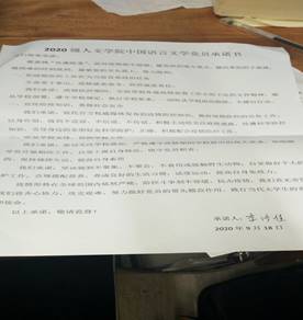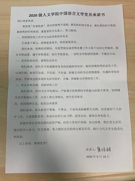 会议结束之后2020级中文班的全体党员都签订了党员责任状,努力做到把疫情防控工作作为当前首要政治任务;宣传防疫知识,重视社会安全;听从学校安排,协助学校工作。齐心协力,攻克艰难,努力做好党员的带头模范作用。