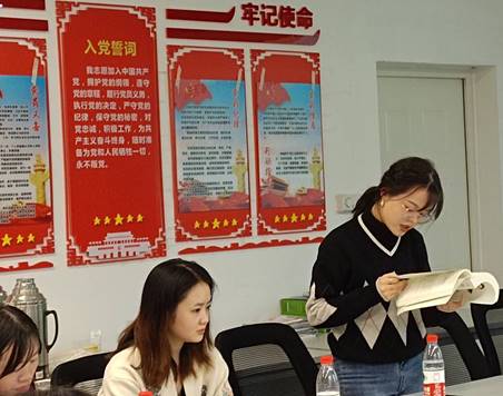 最后由支部的同志们分享了最近阅读书籍。雒培竹同志对《习近平“不忘初心,牢记使命”论述摘编》的第十部分“新时代要有新气象,更要有新作为”的内容提出了自己的感悟,她认为作为新时代的研究生应该走在时代的前列,做有理想、有道德、有文化、有纪律的“四有青年”,助祖国谱写时代的新篇章。刘心睿同志对《苦难辉煌》第四节的内容进行朗诵,并在分享环节重点强调信仰的重要性。无论面对多么艰险的环境,共产党员都要始终满怀信心,保持心中那份对中华民族伟大复兴的信仰,朝着心中的目标不断前进。我们应该始终追随中国共产党的领导,努力做对中国现代化建设有益的民族脊梁。