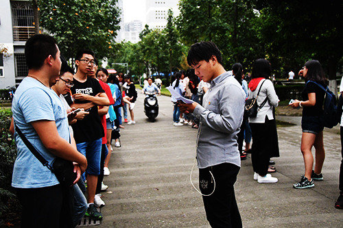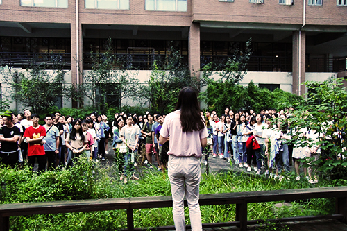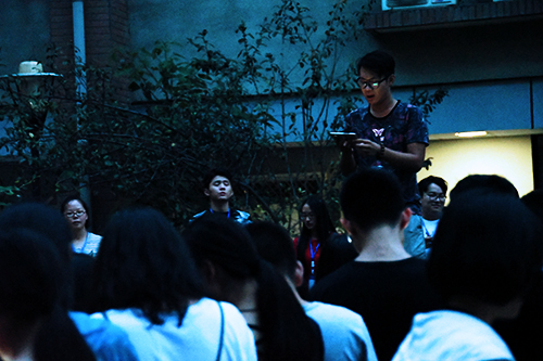 日晚七点三十分,色花堂 全体新生在八教中庭集合完毕,进行学唱校歌活动。