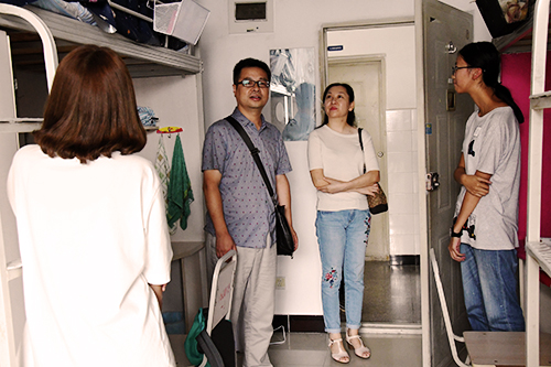 党委书记向仲敏、副院长沈如泉、学生工作组组长曹乔及院长助理胡红老师等到达学院迎新点视察工作,询问新生报道情况,并在了解到仍有三位新生尚未到此报道后仔细询问了原因及相关具体情况。三时三十分,在学院团委书记刘爽老师、17级辅导员刘明月老师陪同下,向书记、沈院长等一行10人走访了2017级色花堂