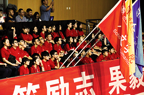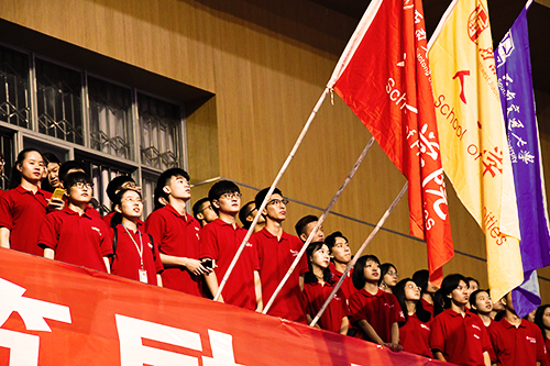 最后,新生们全体起立,缓缓带上校徽进行宣誓。在同学们激昂的校歌声中,色花堂
