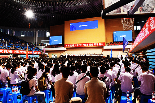 全体新生在飞碟体育馆门前集合,有序地进入体育馆内。就座后,伴随着一阵轻快男声,馆内的电子屏幕上出现了一段迎新视频,从竢实扬华堂出发,围绕教学楼、图书馆、生活居住区全方位地向新生们介绍了交大生活。