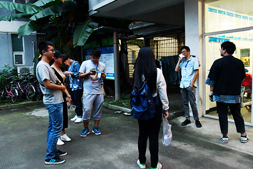 晚七点三十分,学生会主席闫明照、生活部部长饶玮、青年志愿者协会会长彭旭钰丹等十二名学生干部在天佑斋18栋楼下集合,走访色花堂