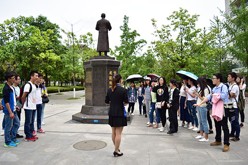 游园活动自南门开始,途经机车博览园,最终折返至“竢实扬华”碑。据赵育汀介绍,我校校门与清华园的大门均出自同一设计师之手,故风格相近。而机车博览园中的三列机车皆是前艺术与传播学院院长徐伯初教授于全国各地寻求而来,每一辆机车都经过了徐教授的千挑万选,并承载了深厚的历史。“竢实扬华”碑上绘有交大百年以来的各所大门;碑的两侧分别刻有中国最早的大学毕业证书与交大校歌;碑的背面记载着交大曲折的搬迁历史。游园队伍沿着交大的南北中轴线前行,经过一教、二教、四教,遍览了包括孙中山、张维、刘恢、严恺、林同炎等诸位先生在内的塑像。这些先贤多是为中国的发展做出了巨大贡献的两院院士,并都与交大有着不解之缘。