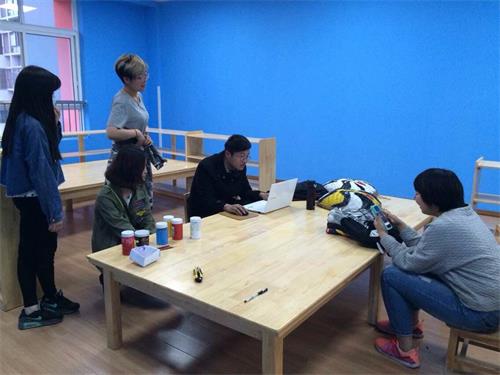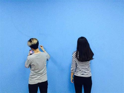 经过三个小时的努力,幼儿园科技实验室的四张蓝底墙面被填满了各式图案。
