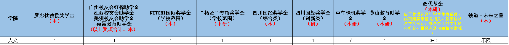 我院学校范围专项奖助学金可推荐名额如下: