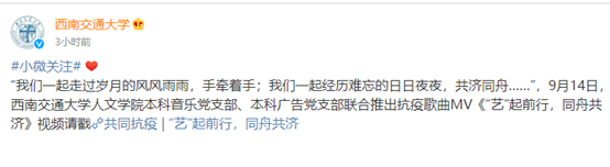 疫情艰难时刻,万千大众努力。为响应成都市疫情防控要求,我校自8月31日起实行临时封控,落实疫情防控各项要求,开展疫情防控工作。这首歌曲以视频的形式展现了学校领导老师以及志愿者大力宣传防疫知识、引导学生做核酸、维护核酸检测点秩序的工作画面,幕幕真实真切,令人感动;歌词朴实暖心,激励师生同舟共济,齐心抗疫。