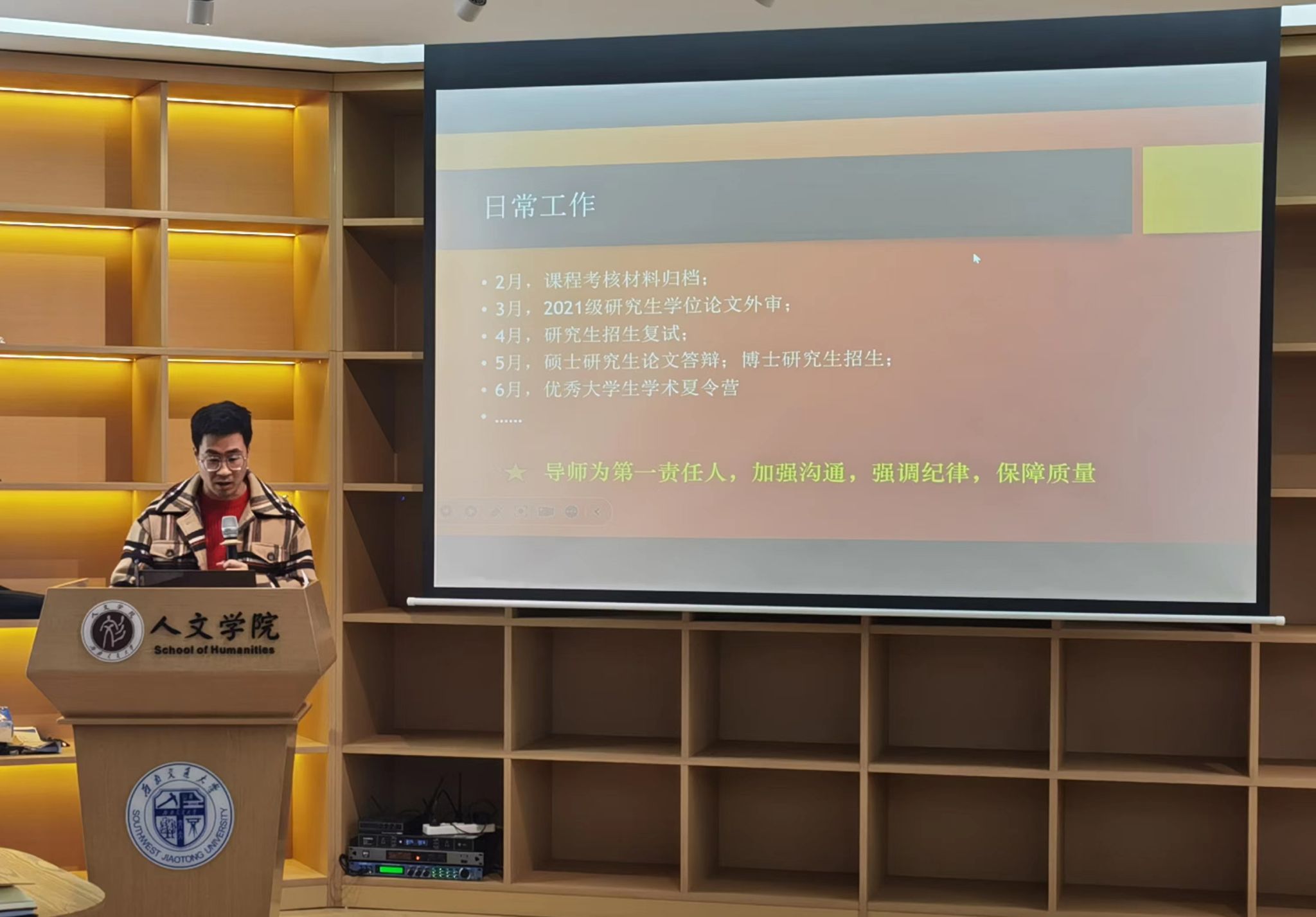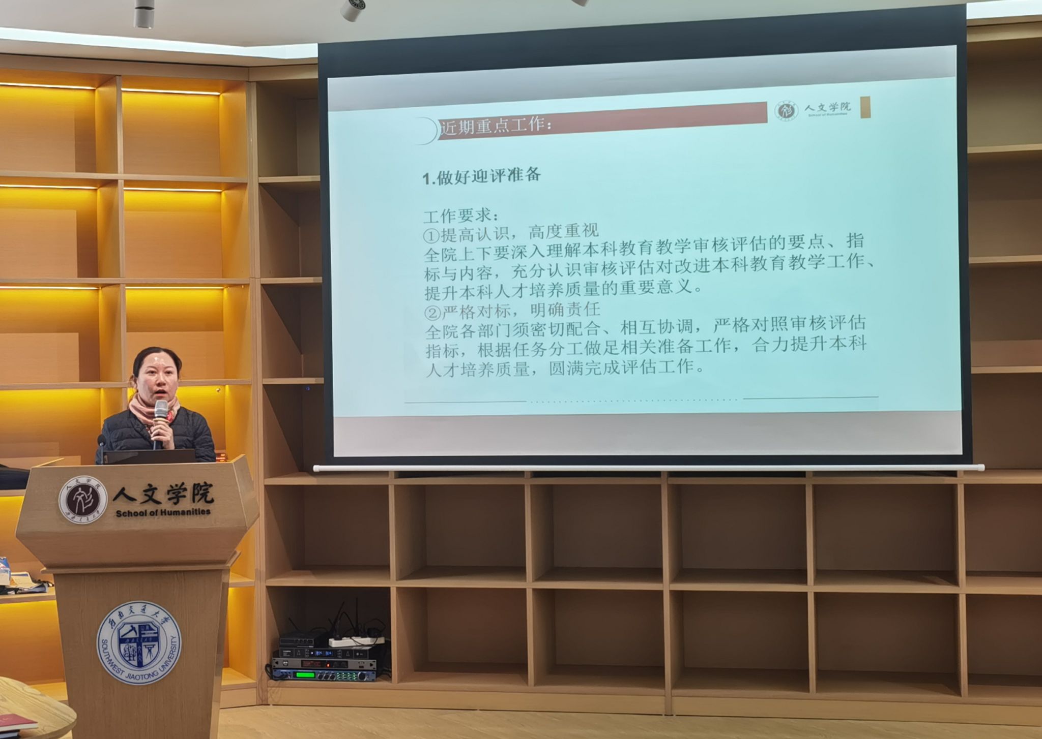 接下来,副院长胡红对本科教学工作进行规划部署。胡院长提出新学期重点工作包括做好本科教育教学迎评工作,同时以评促建,提升学院本科教学质量保障能力,同时做好日常教学、毕业设计中期检查、论文答辩、抽检工作等常规工作。做好学院资产管理等相关工作。