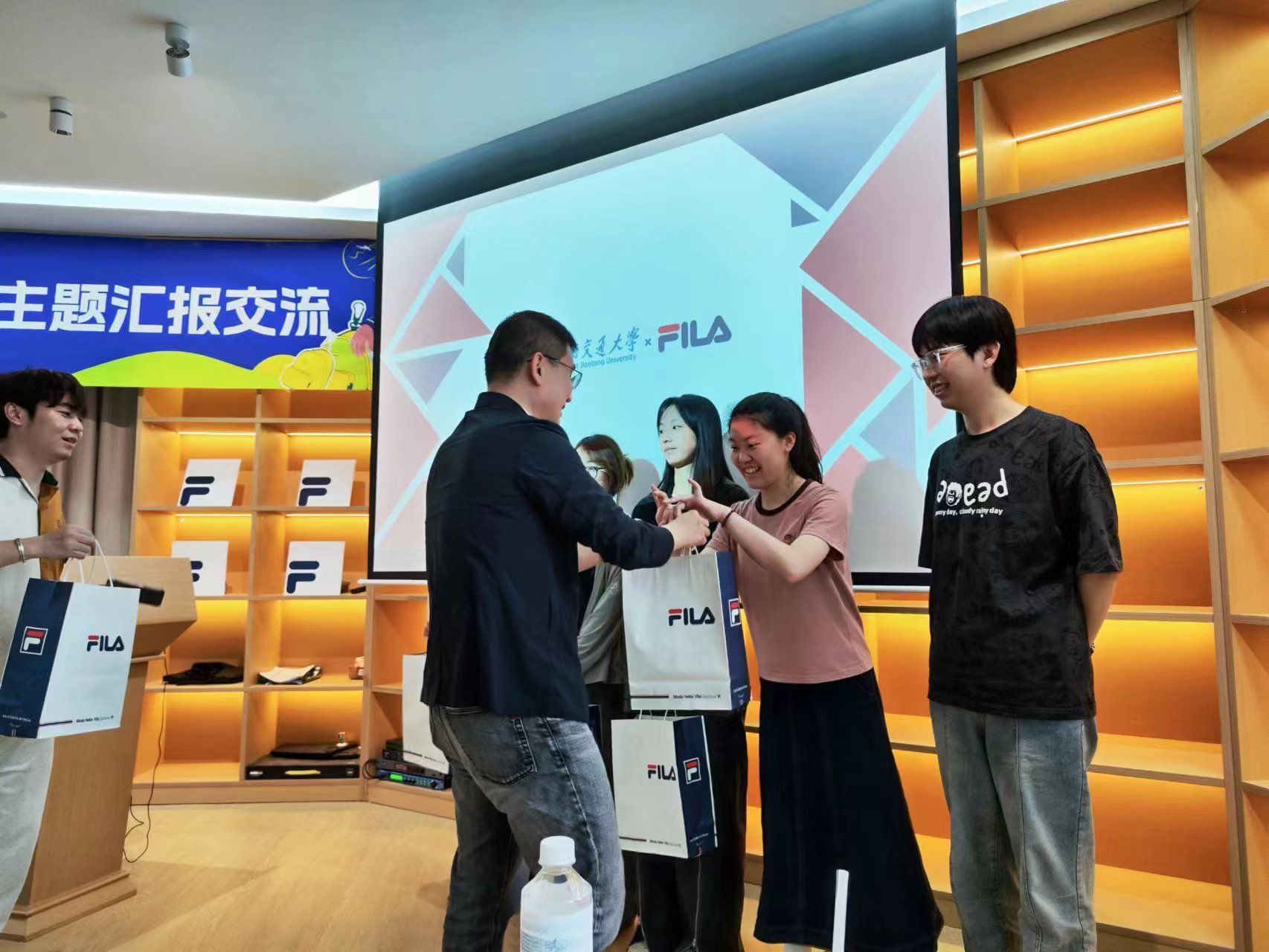 截止当日下午18:00,所有学生小组均完成了课题汇报,主持人随即汇总了所有小组的考核分数、统计出本次课程考核的前三名。FILA零售人力资源总监王壮先生为前三名的小组颁发了奖品。色花堂