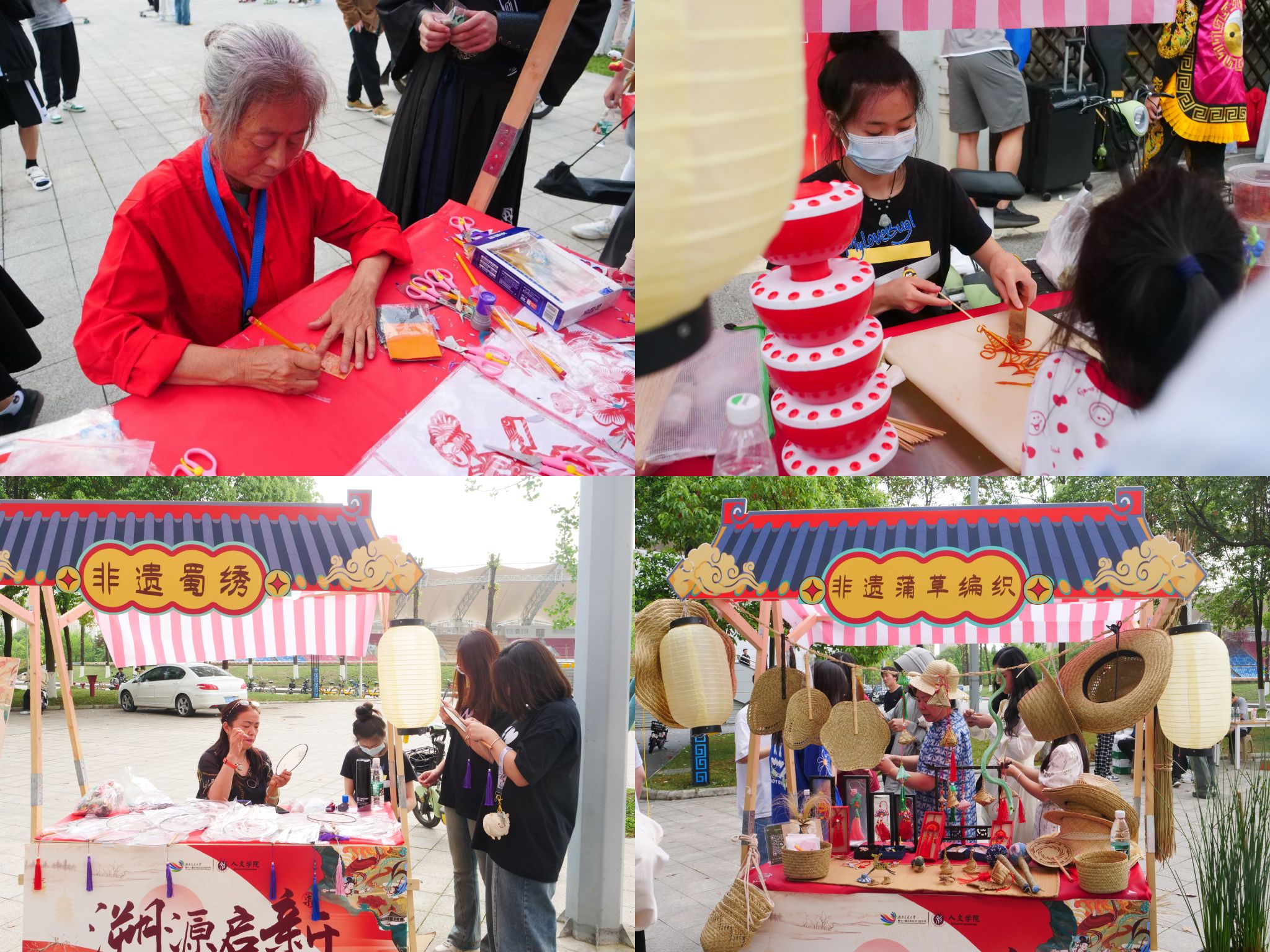 在传统文化集市展示与体验现场,设置糖画、蜀绣、剪纸、脸谱、捏面人、蒲草编织、漆画团扇和创意绳编等非遗项目,以及甲骨奇遇、汉服、书画、茶艺、彩绘、香囊、钩针编织、国风发饰、国风手串、射艺和国潮滑板等国风、古风和民俗文化项目,共同为师生们呈现了一场丰富多彩的文化盛宴。