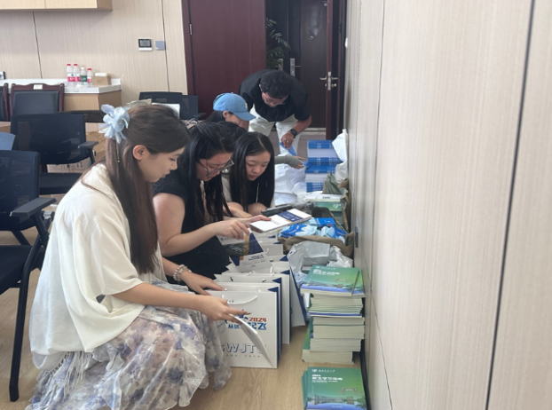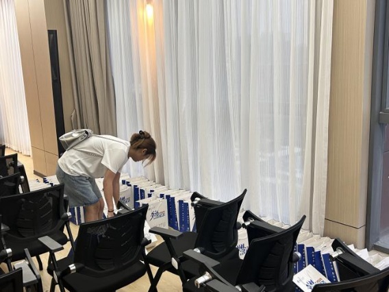 迎新工作筹备会。学院团委书记刘爽老师、新生辅导员朱思颖老师、团委学生干部、2024级新生班协以及迎新志愿者参加了此次筹备会。团委学生干部、班协以及志愿者在朱思颖老师的指导下开始忙碌地开展筹备工作。从搬运新生入学相关物资并整齐装袋到精心布置色花堂