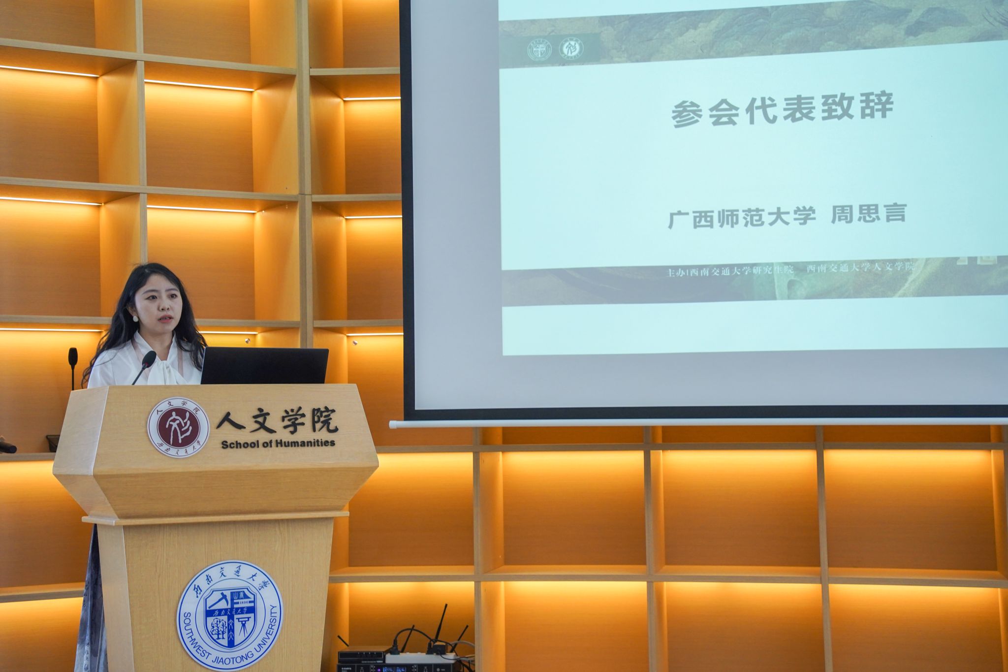 继续深造。来自广西师范大学的周思言博士作为参会代表致辞,表达了对未来学术道路的坚定求索态度以及对本次学术竞赛组委会提供的交流与互鉴平台的感谢。