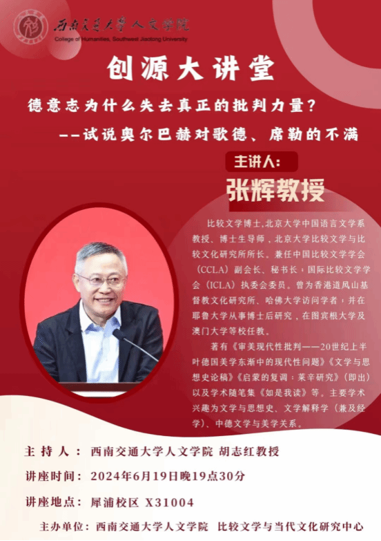 主讲人介绍:张辉,比较文学博士。北京大学中国语言文学系教授、博士生导师,北京大学比较文学与比较文化研究所所长。兼任中国比较文学学会(CCLA)副会长、秘书长;国际比较文学学会(ICLA)执委会委员。曾为香港道风山基督教文化研究所、哈佛大学访问学者;并在耶鲁大学从事博士后研究,在图宾根大学及澳门大学等校任教。著有《审美现代性批判——20世纪上半叶德国美学东渐中的现代性问题》《德意志精神漫游:现代德语文本细读》《冯至:未完成的自我》《文学与思想史论稿》《启蒙的复调:莱辛研究》(即出)以及学术随笔集《如是我读》等。主要学术兴趣为文学与思想史、文学解释学(兼及经学)、中德文学与美学关系。
