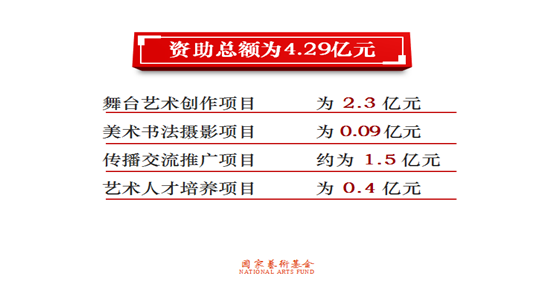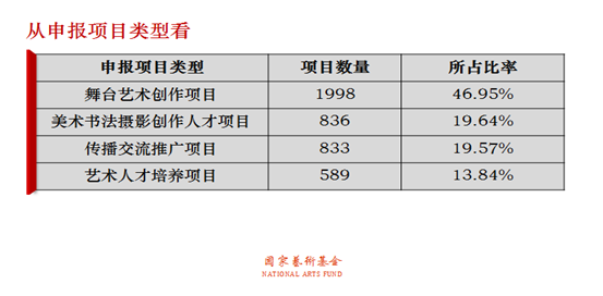 舞台艺术创作项目1998项(其中大型舞台剧和作品1056项,小型剧节目和作品942项),占申报总量的46.95%;美术书法摄影创作人才项目836项,占总量的19.64%;传播交流推广项目833项,占总量的19.57%;艺术人才培养项目589项,占总量的13.84%。