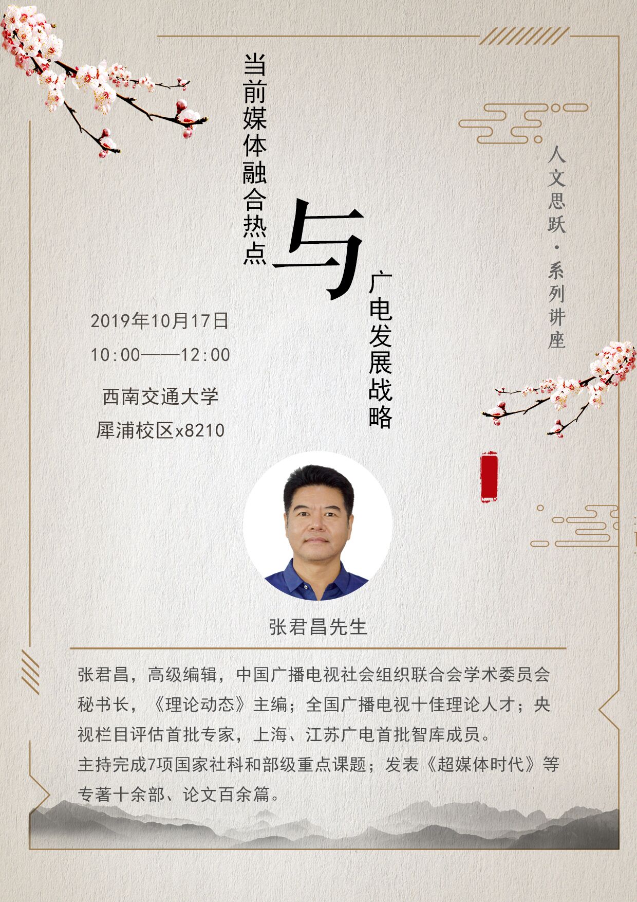 【主讲人简介】张君昌,高级编辑,中国广播电视社会组织联合会学术委员会秘书长,《理论动态》主编;全国广播电视十佳理论人才;央视栏目评估首批专家,上海、江苏广电首批智库成员。主持完成7项国家社科和部级重点课题;发表《超媒体时代》等专著十余部、论文百余篇。