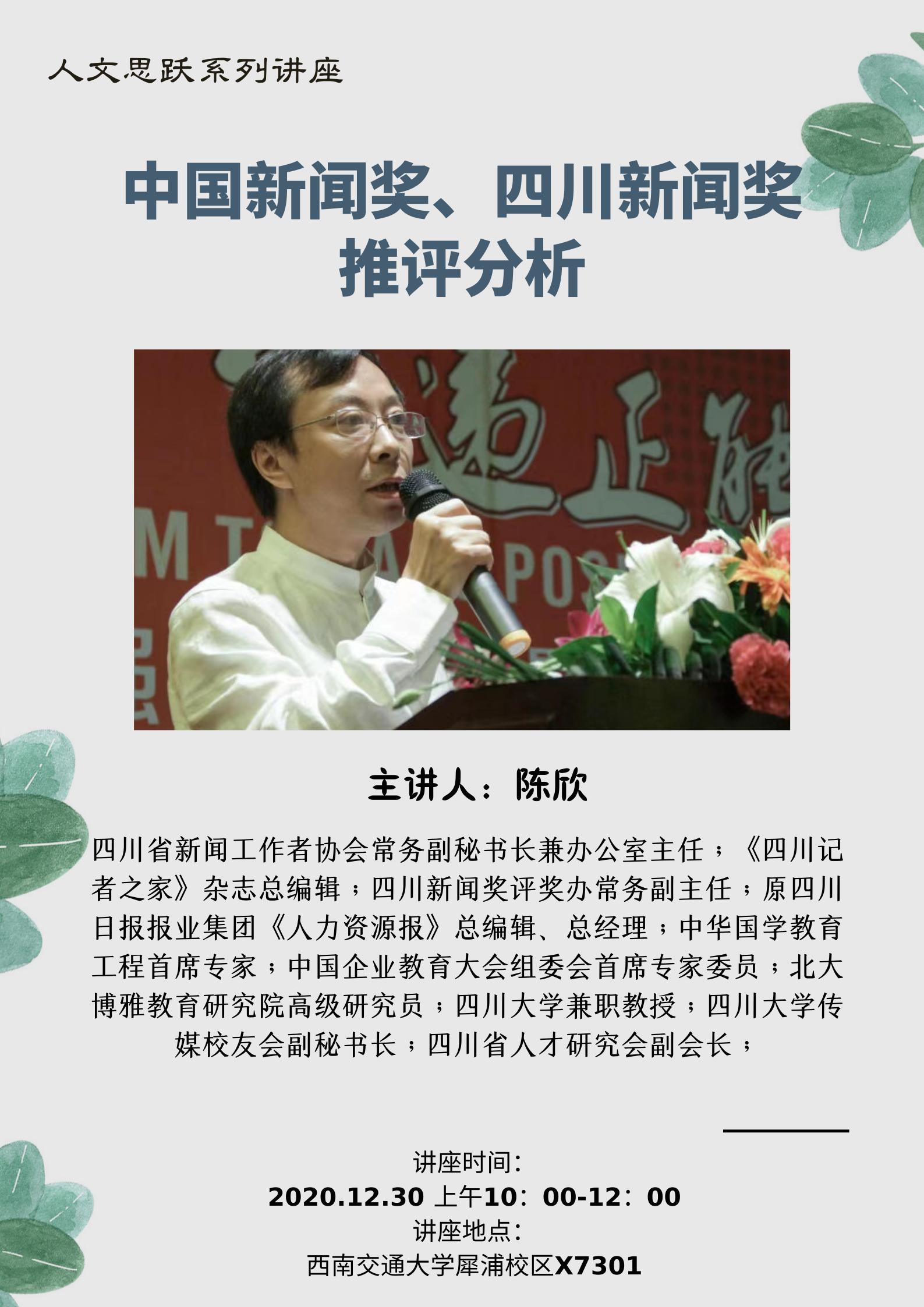 主讲人简介:四川省新闻工作者协会常务副秘书长兼办公室主任;《四川记者之家》杂志总编辑;四川新闻奖评奖办常务副主任;原四川日报报业集团《人力资源报》总编辑、总经理;中华国学教育工程首席专家;中国企业教育大会组委会首席专家委员;北大博雅教育研究院高级研究员;四川大学兼职教授;四川大学传媒校友会副秘书长;四川省人才研究会副会长。