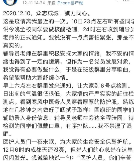 The teachers comforted the students with warm words: "Please don't panic. Listen to the arrangement of the school. When you go out for nucleic acid testing, you must wear thick clothes. The teacher believes that everyone will be well. Our Pixian Bean Paste will win!"